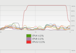 C로 만든 4개의 쓰레드 프로그램에선 4개의 코어가 계산에 동시에 참여함을 알 수 있다. 중간에 약간 요동치는 부분은 OS의 스케쥴러에 의한 것인 듯 하니 신경쓰지 말자.
