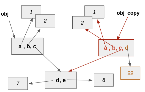 위 2가지가 기본적인 참조를 통한 객체의 복사와 얕은복사의 차이점이며 내부 객체요소는 여전히 복사본과 원본이 동일한 참조를 가집니다. 이 부분이 일반적이 설명이며 핵심이지만, 외부 컨테이너가 새롭게 생겼다는 점 역시 중요한 포인트입니다.