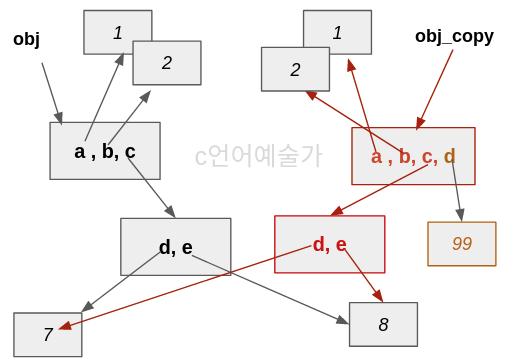 내부의 c 객체가 깊은복사가 되어 원본과 복사본이 서로 연관이 없게됩니다.