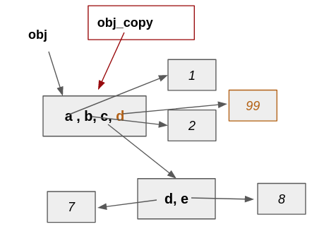 console.log(obj_copy); // { a: 1, b: 2, c: { d: 7, e: 8 }, d:99 }