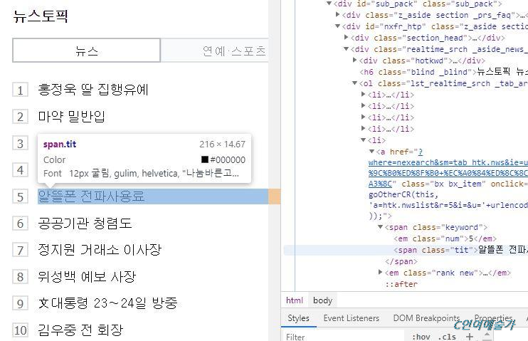 종종 글을 읽다보면 웹크롤링을 하거나 html 파싱을 한다는 말을 자주 듣는다. 또는 스크래핑을 한다고도 하는데 용어가 혼동되기도 한다. 원래의 뜻을 살펴보면 크롤(crawl)은 기어가다는 뜻이다. 스크랩(scrap)은 단편의 정보를 뜻하고 파싱(parse)은 분석한다는 뜻이 강하다. 위 세가지를 종합해보면 기어다니면서 단편의 정보를 모아서 분석한다? 응? 말되네? 최신 빅데이터와 데이터 수집을 위해서 크롤링이나 스크래핑을 많이 하는 추세다. 그리고 크롤링과 스크래핑을 구별하는 것은 크게 의미가 없다고 본다. 대략 크롤링과 스크래핑은 인터넷의 정보를 모으는 일을 생각하면 된다. 그러면 파싱이란? 예를들어 시간에 대한 표현을 보면 "2019년 12월 10일"이라면 표현이 있다. 이 표현을 '년' 앞에는 년..